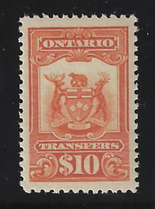 247 nh imageONTARIO, Stock Transfer Tax Stamp, "$10.00 Orange" (1910-26 Period), Van Dam #OST14, MNH, OG, Sound Cond., VF, Cat. Value is $140.00 (Est.) (Image) 140.00E