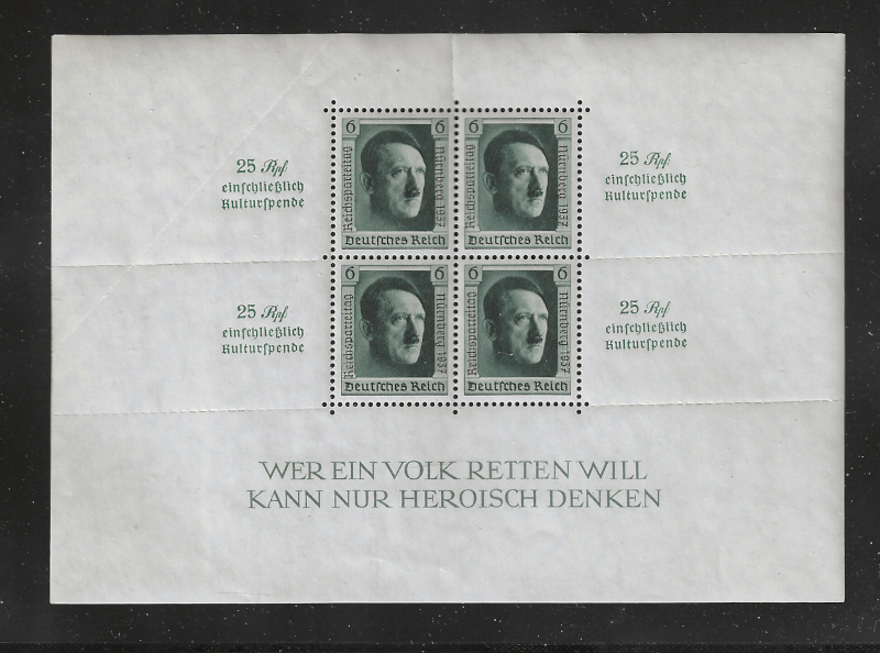 313 nh imageB106 "Nuremburg Congress" Souv. Sheet, 1937 Issue, OG, MNH, Diagonal Crease in Left Margin, Otherwise Sound Cond., VF, SCV is $240.00 (Image) 240.00