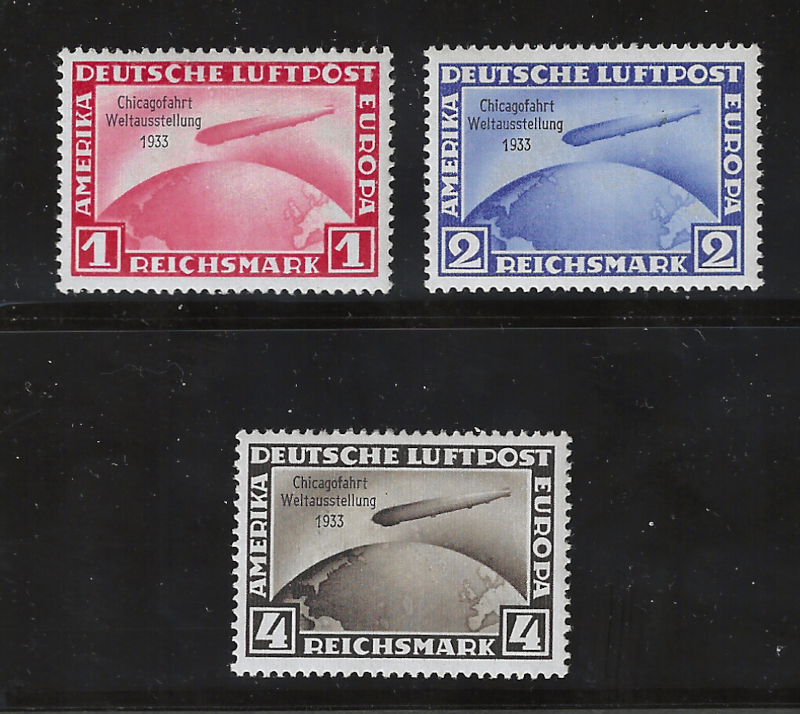316 og imageC43-C45 (3), Cmpt. Set, "Zeppelin Chicago Flight" (1933 Issue), Unused, OG, VLH, Almost Looks NH, Sound Cond., VF, SCV is $900.00 (for Hinged Stamps) (Image) 900.00+