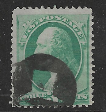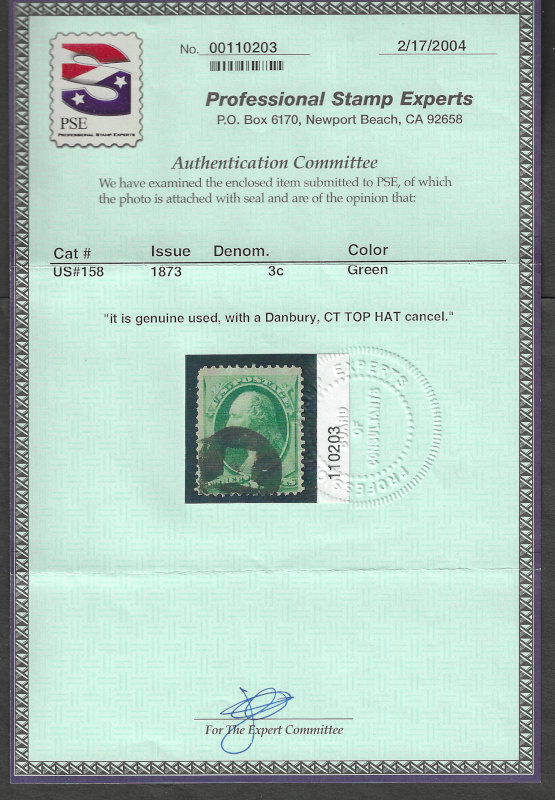 27 O image158 "3 c. Green", 1873 Issue, Used (with Danbury, CT "Top Hat" Fancy Cancel), Sound Cond., Fine, Cancel is XF, With "PSE" Cert. Stating "Genuine Cancel" (Image) (image2) (All Images)