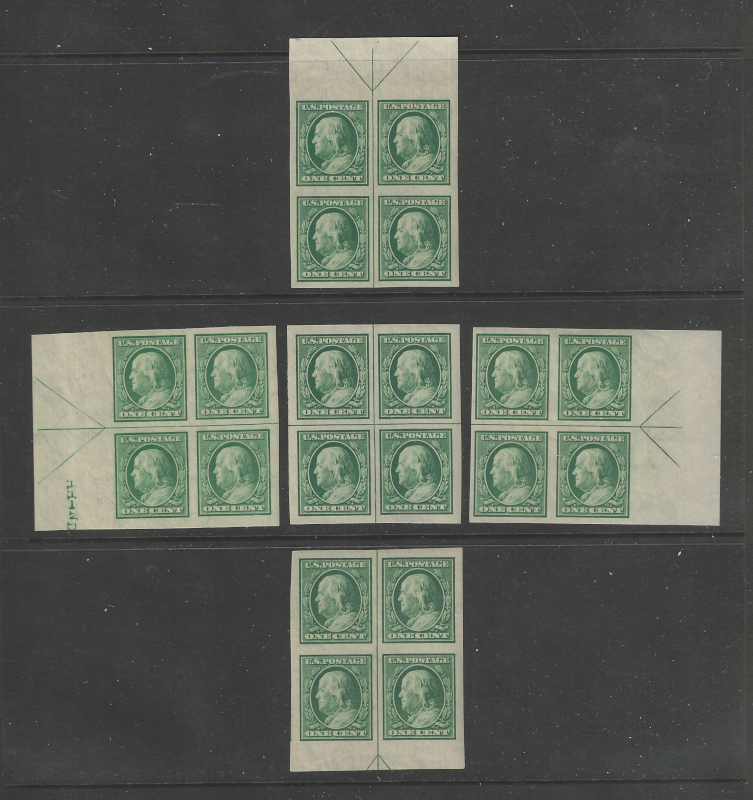 38 nh,og image343 "1 c. Green" (1908 Issue), Imperf., Cmpt. Set of Arrow & Centerline Blocks (4 Stamps Each), Unused, OG, Top & Left Arrow Blks. are MNH, Other Blks are Hinged on the Top 2 Stamps, Sound Cond., VF-Superb Centering, SCV is $250.00 (Image) 250.00E