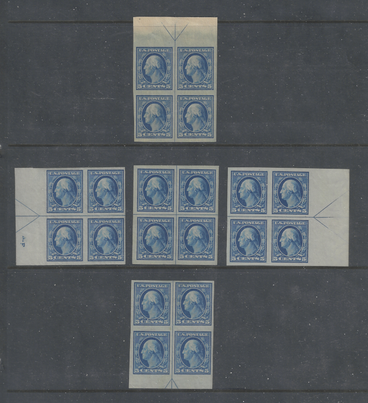39 nh,og image347 "5 c. Blue" (1909 Issue), Imperf., Cmpt. Set of Arrow & Centerline Blocks (4 Stamps Each), Unused, OG, Left & Right Blks. are MNH, Other Blks. are Hinged on the Top 2 Stamps, Sound Cond., VF-XF Centering, SCV is $900.00 (Image) 900.00E