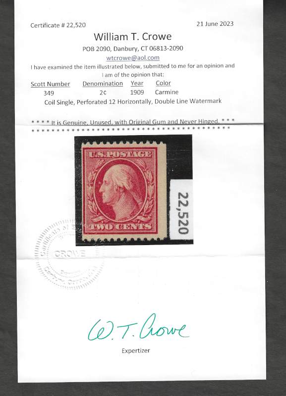 40 nh image349 "2 c. Carmine", Coil Single, 1909 Issue, Sound Cond., Unused, OG, MNH, Fine, With 2023 "Wm. Crowe" Cert. Stating "Genuine, MNH", SCV is $235.00 (Image) (image2) (All Images)