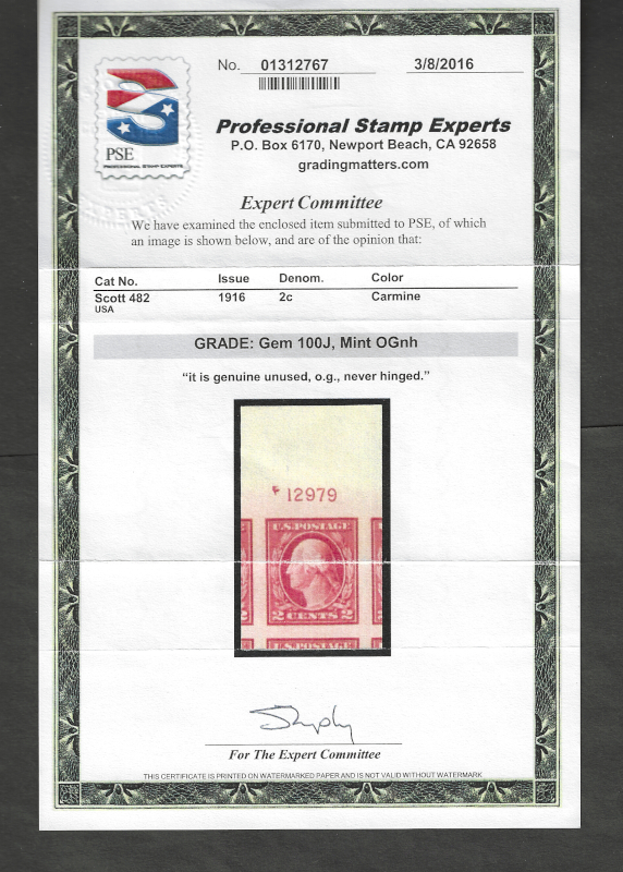 48 nh image482 "2 c. Carmine", 1916 Imperf. Issue, Top Margin P# 12979 Single (with Portions of 5 Adjacent Stamps), Sound Cond., OG, MNH, Superb, with 2016 "PSE" Cert. Stating "Gem 100J, MNH, OG", SCV is $65.00 for Grade: Gem 100J (Image) (image2) (All Images)