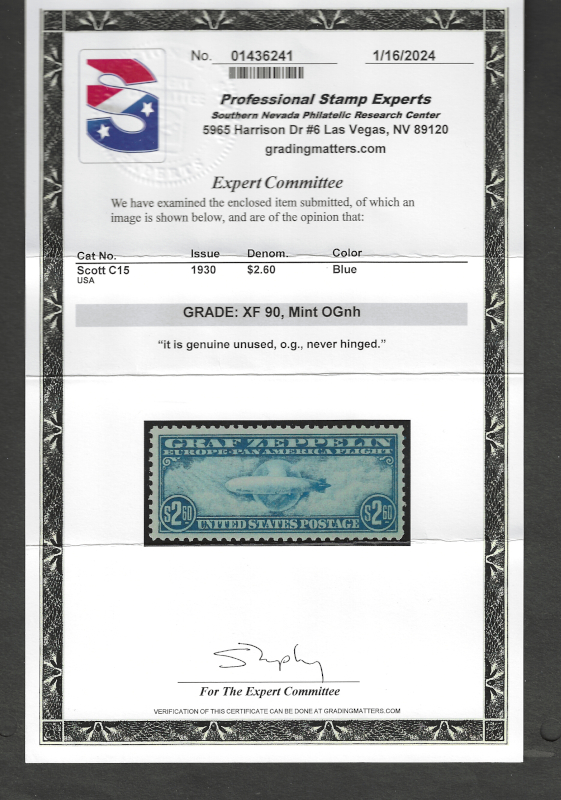 81 nh imageC15 "$2.60 Blue", 1930 Zeppelin Issue, Sound Cond., OG, MNH, Graded XF-90, with 2024 "PSE" Cert. Stating "Genuine, MNH", SCV is $1,150.00 (for Grade XF-90) (Image) (image2) (All Images)