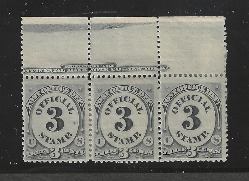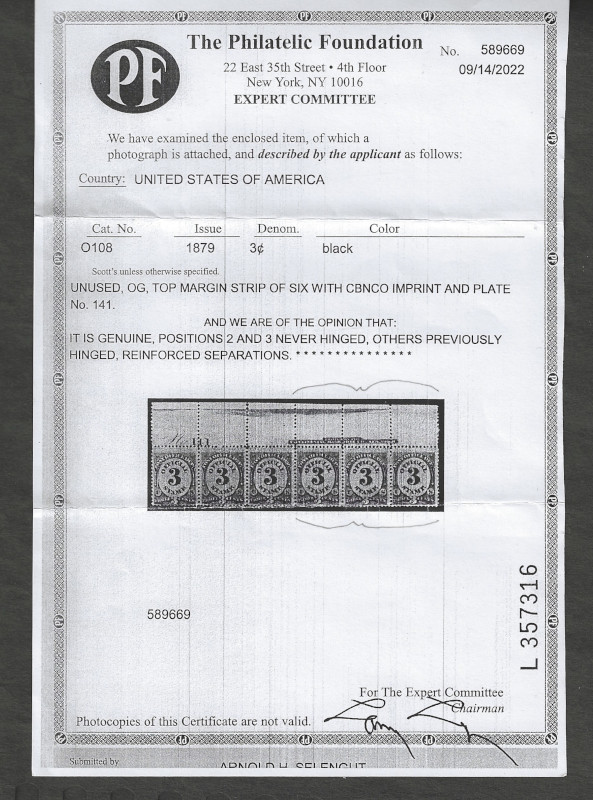 89 og imageO108 "3 c. Black", 1879 "Post Office" Issue, Top Margin "CBNCO" Imprint Strip of 3, Sound Cond., Unused, OG, Hinged, F-VF, With a Photocopy of a "PF" Cert. for a Strip of 6 (This Being Stamps 4 to 6), SCV is $90.00 (for 3 Hinged Singles) (Image) (image2) (All Images)