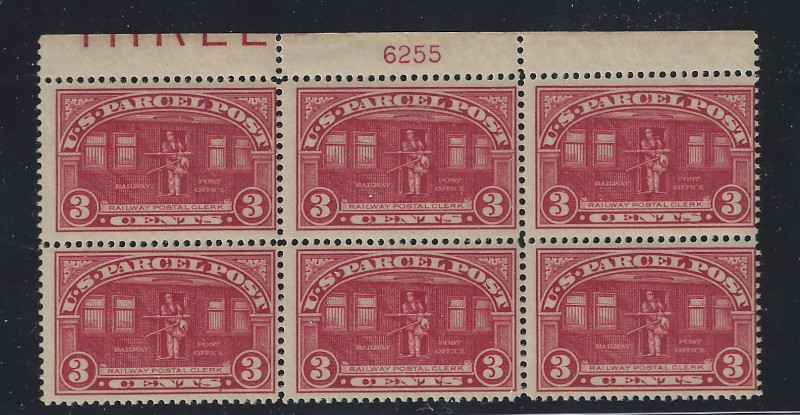 91 nh imageQ3 "3 c. Carmine", 1913 Parcel Post Issue, Top Margin P# 6255 Blk. of 6, Sound Cond., OG, MNH, Fine, SCV is $375.00 (Image) 375.00