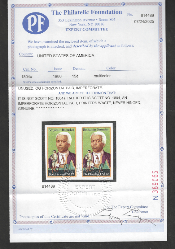 96 nh image1804 Horiz. Pair, Imperf., "Banneker" (1980 Issue), MNH, OG, Sound Cond., VF, With "PF" Cert. Stating "Genuine", Probably Printers Waste (Image) (image2) (All Images)