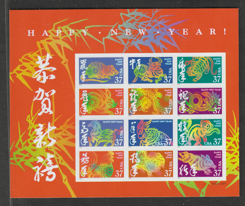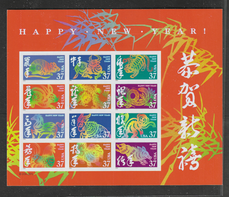 105 nh image3895m "37 c. Chinese New Year", Sheet of 24 Stamps, 2005 Issue, Side One has Normal Die-Cutting, Reverse Side has Shifted Die-Cutting, Which Cuts in Half Horizontally the Bottom 9 Stamps, Die-Cutting is Missing on "a", "b" and "c" (Top Row), Sound Cond., VF, SCV for the "Imperf" Stamps Alone is $500.00 (Image) (image2) (All Images)