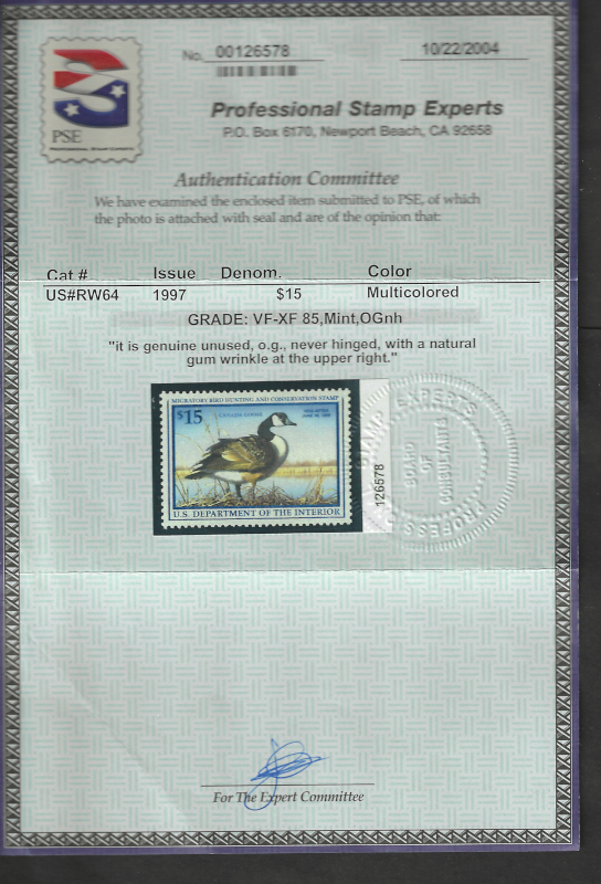 120 nh imageRW53 // RW76, 6 Diff., 1986 // 2009 Issues, Sound Cond., OG, MNH, VF-XF, #RW64 with 2004 "PSE" Cert. (Graded VF-XF 85), The Other 5 Stamps are Equally Well Centered, SCV is $222.50 (for VF-XF Grade), Face Value is $82.50 (Image) (image2) (All Images)
