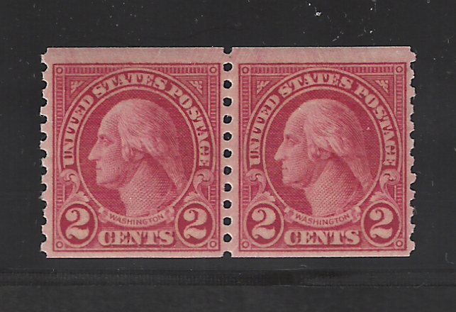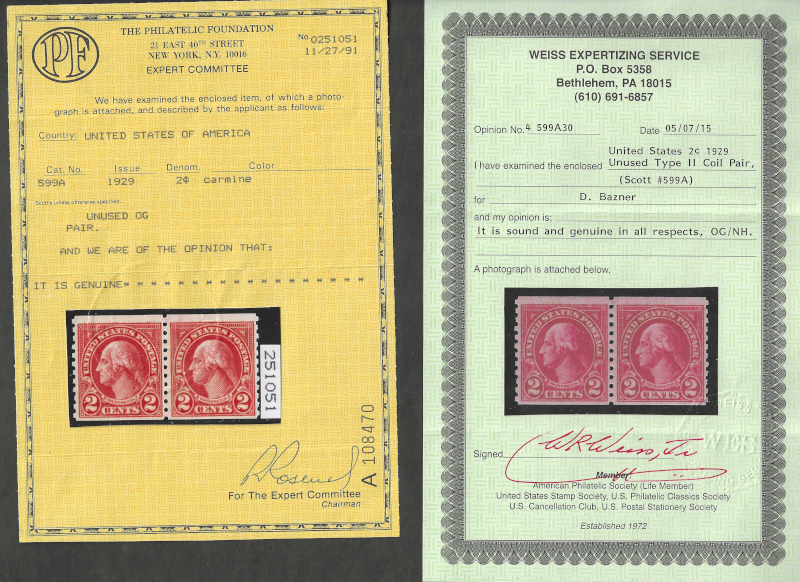 64 nh image599A "2 c. Carmine" Type II, Coil Pair, 1929 Issue, Sound Cond., Unused, OG, MNH, F-VF, With 1991 "PF" & 2015 "Weiss" Cert. Stating "Genuine, NH", SCV is $475.00 (Image) (image2) (All Images)