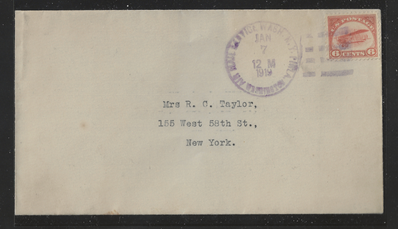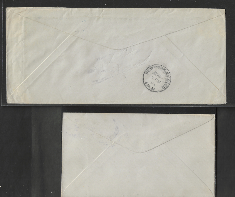 80 c imageC1, C2, Two Diff. Airmail Flight Covers, #C1 with Jan. 7, 1919 Wash. D.C. Postmark (Sent to New York), AAMC #101, Sound Cond., Unopened, VF, Plus #C2 on "Aerial League of America" Business Envelope, With Wash. D.C. Cancel (Aug. 12, 1918) Sent to New York with Aug. 12, 1918 Backstamp, AAMC #107, Cover with some light Wrinkles, Neatly Opened at Left & Top, F-VF (Image) (image2) (image3) (All Images)