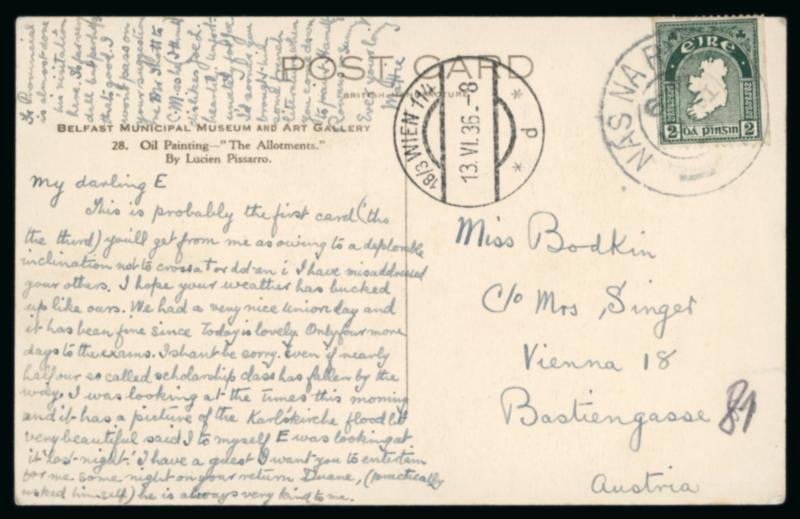 Lot 60402 - The Unique Usage to a Foreign Destination 1922 SE 2d blue-green, experimental coil, perf. 15 x imperf, single on picture postcard from Father Matthias Badkin at Clongowes Wood College to his sister in Vienna, Austria, tied by NÁS NA RIOGH/10,VI.36 large double ring ds, arrival alongside, few short perfs, a wonderful example of this major Irish rarity, one of only four usages recorded; cert. BPP (2019).... Currently GPB 8,000