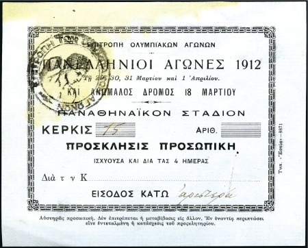 40102   image1912 Panellinios Games ticket, with attractive Olympic cachet, unusual & scarce