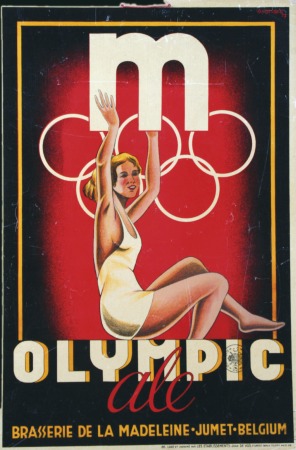 40161   image“Olympic Ale / Brasserie de la Madeleine / Jumet / Belgium” advertising poster, 365x316mm card, showing a female athlete holding the letter “m” in front of the Olympic rings, not dated, minor wear, attractive and unusual item