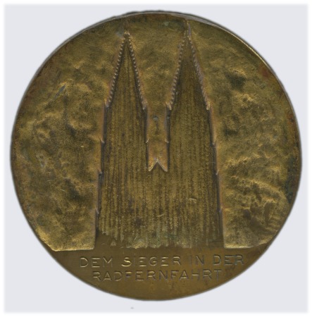 40217   image1926 Deutsche Kampfspiele, Cologne. Gold Winner’s medal in Cycling, 88mm, gold plated cast bronze, showing two wrestlers in high-relief on front and Cologne cathedral above “DEM SIEGER IN DER / RADFERNFAHRT” on reverse, toned