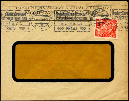 40213   image1925 Prague SPECIAL CONGRESS MACHINE CANCEL: Czech 1920-25 10h bistre tied on envelope sent locally in Prague by the special Congress machine cancel, very fine and scarce, also 10h on piece showing “Rowing Champions of Europe” special machine cancel