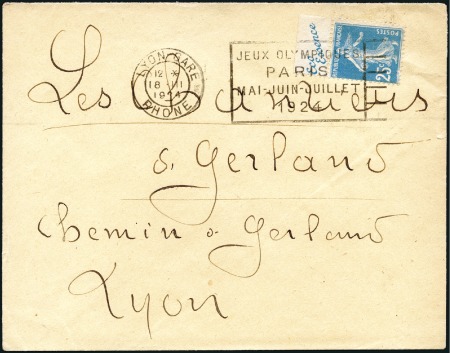 40197   imageTwo envelopes with special Olympic machine cancel, one envelope with 25c Semeuse with publicity tab, tied by Lyon Gare 18.3.24 cancel, and other with Rue Des Halles / Paris 10.6.24 cancel, very fine