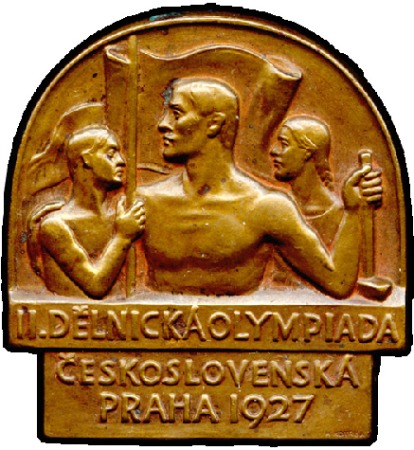 40219   image1927 Second Workers’ Olympia, Prague. Pin badge showing worker between and girl and a boy above legend, fine