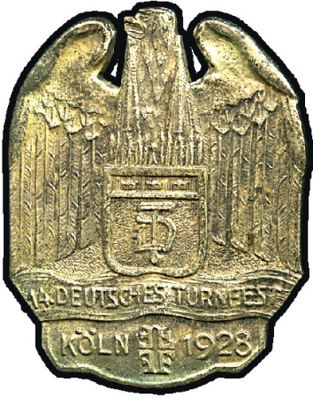 40220   image1928 14th German Gymnastics Festival (Turnfest) in Cologne. Pin badge, 34x45mm, silvered, showing eagle above logo and legend, made by Carl Poellath (maker’s mark on reverse), fine