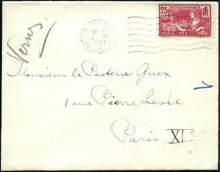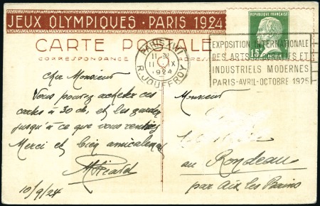 40196   image1924 Olympic Issue 10c, 25c, 30c and a 10 defininitive tied to cover by 2 Olympic roller cancels of “PARIS 47 R.LA BOETIE 6.6.1924 JEUX OLYMPIQUES P A R I S MAI-JUIN-JUILLET 1924”, one adhesive with small corner tear or crease otherwise fine and scarce