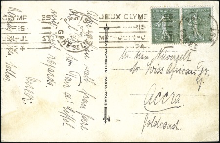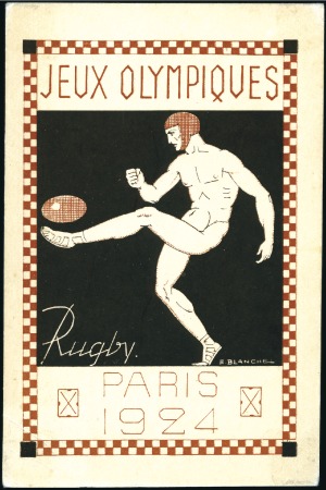 40201   image15c Art Deco Pasteur postal card featuring Rugby, sent on FIRST DAY OF ISSUE 25.08.1924 from Paris to Paris with “Jeux Olympiques Paris Mai-Juin-Juillet” machine cancel, very fine, extremely rare