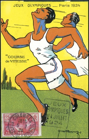 40203   imageIllustrated postcard by Floowy depicting sprinters with 25c Olympic stamp on obverse tied by “COLOMBES / STADE OLYMPIQUE” cds and Games cachet adjacent, very fine
