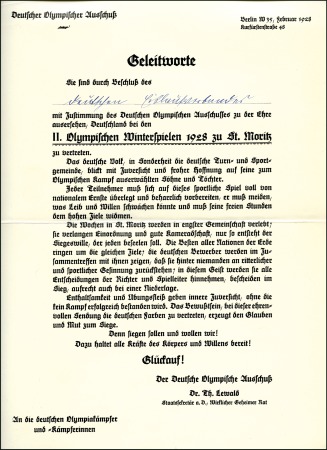 40223   imageGerman Olympic Committee invitation to a participant for the St. Moritz Games, printed invitation with handwritten name on card, small split on horiz. fold and corner crease, otherwise fine and scarce