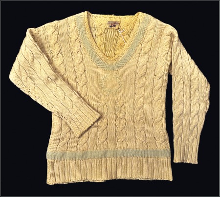 40188   imageWhite woollen jumper belonging to H. M. Abrahams, the famous British sprinter who won gold in the 100m in 1924 and was immortalised in the movie Chariots of Fire (which one four Academy Awards incl. Best Picture), with Bodger & Co. of Cambridge maker’s label with “H. M. Abrahams” written on, obviously worn during his time at Cambridge University, with light blue collar and laurel branches in the centre, also with a pair of running shorts and a leather briefcase