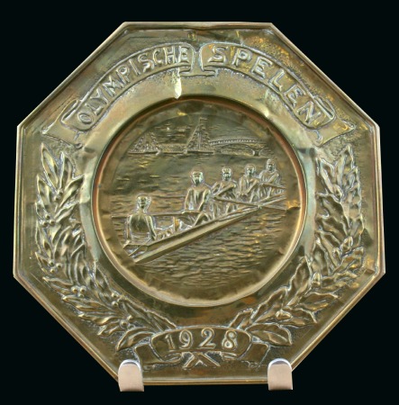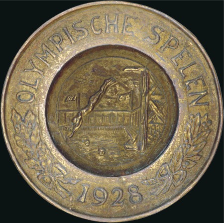 40267   1928 Amsterdam commemorative plate in blue and white ceramic, 250mm, made by Société Céramique, Maastricht, showing Amsterdam coat of arms and “IXe OLYMPIADE”, surrounded by garland and 6 images of Olympic events