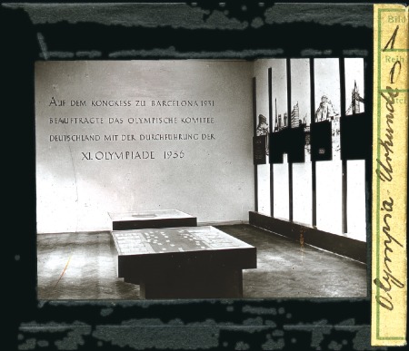 40277   image1930s Glass slide showing museum (?) with inscription “At the congress of Barcelona 1931, the German Olympic Committee was assigned to execute the XI Olympiad of 1936” on the wall, single crack