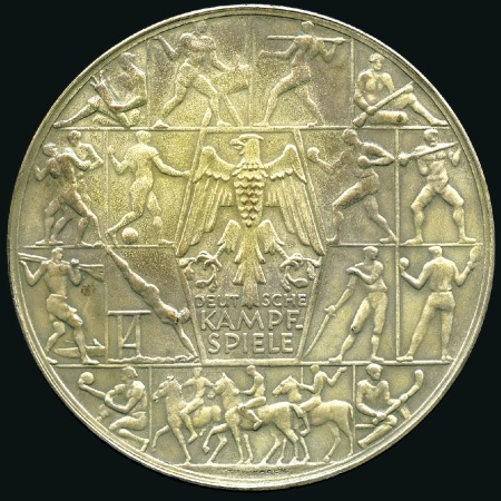 40279   image1930 Deutsche Kampfspiele in Breslau. Second place medal, 90mm, silvered, showing eagle surrounded by athletes in different events on one side, other with legend and coat of arms, incl. original case, very fine
