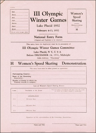 40282   imageOfficial entry form (unused) for the Women’s Speed Skating demonstration events, 217x355mm, 3 pages (one original, one duplicate and one triplicate), very fine