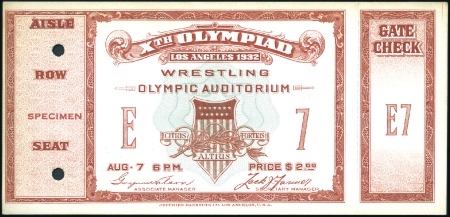 40301   imageTickets: Group of 13 tickets with SPECIMEN overprint and control punches incl. Lacrosse Aug 9 & Aug 12, Wrestling Aug 3, Aug 4, Aug 7 & Aug 7 Balcony, Weightlifting Jul 31, Rowing Aug 10 & Aug 12, Swimming Aug 7, Equestrian Aug 13, Track & Field Aug 1 & Aug 6