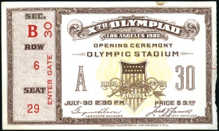 40293   imageOfficial invitation from the Los Angeles Olympic Committee to Great Britain to participate in the 1932 Games, 224x277mm, with Games logo at top, addressee in ornate handwriting by Martin Jackson (from his estate; he was the official writer), dated Feb 1st 1930, not sent (evidently a handwriting trial), incl. large envelope with Games logo and legend, plus one plain, rare