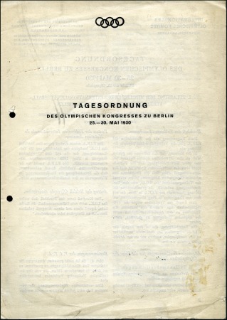 40275   image“Olympic Games Charter, IOC statutes, Regulations and Protocols of the celebration of the Modern Olympics, General Rules applicable to the Olympic Games, Rules of the Olympic Congress,” 63 pages with French, English, Spanish and German text, presumed issued in 1930 before the start of the Congress, printed in Berlin, cover faults, interesting content and rare