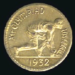 40320   imageOlympic California Gold Half Dollars, 12mm, bronze, one showing a discus thrower and other showing a sprinter in starting position, both with Olympic legend on one side and a bear with value on the other (2)