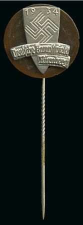 40339   image1934 Deutsche Kampfspiele, Nuremburg. Stick-pin, 20mm, silvered shield with date, swastika and legend on amber back