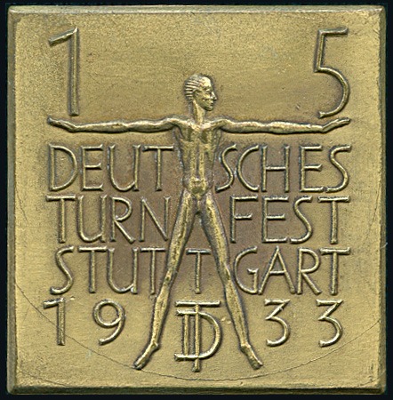 40332   image1933 15th German Gymnastics Festival, Stuttgart: Participants’ badge, bronze, 35x37mm, showing man outstretched with legend either side, fine