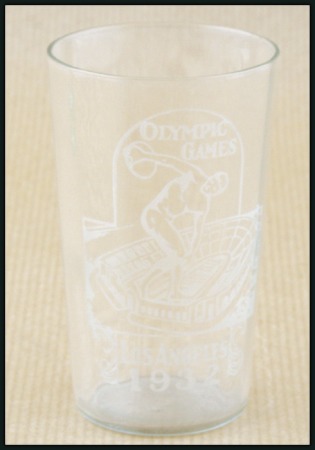40328   imageGlass cup, 55mm diameter, 91mm height, clear glass with white design showing discus thrower above the stadium and “OLYMPIC GAMES / LOS ANGELES 1932,” fine