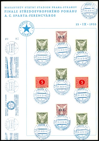 40342   image1935 & 1936 MITROPA CUP: Athletic Club Sparta specially printed sheet for the final of the 1935 Mitropa Cup (aka La Coupe de l’Europe Centrale), with Czech franking tied by special cancel, and two Atheltic Club Sparta booklets produced for the Final of the 1936 Mitropa Cup showing a picture of the stadium, franking inside tied by special machine cancel, fine and unusual football memorabilia (3)