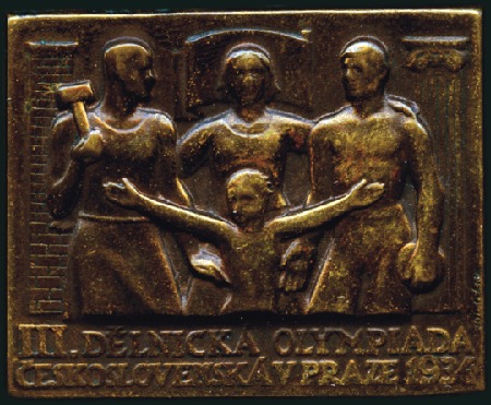 40340   image1934 Third Workers’ Olympiad, Prague 1934. Pin badge showing working family above legend, very fine