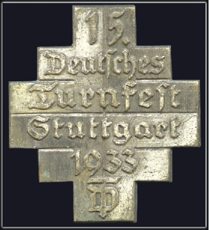 40333   image1933 15th German Gymnastics Festival in Stuttgart. Pin badge, 32x37mm, silvered, cross-shaped with legend, fine