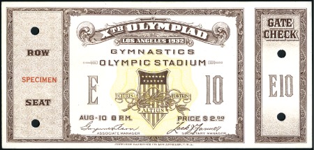 40309   imageTickets: Gymnastics in the Olympic Stadium – Aug. 10, with SPECIMEN ovpt & control punches, fine