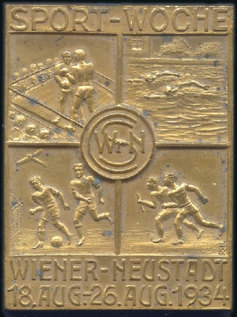 40341   image1934 Sport Week in Wiener-Neustadt, two mini plaques depicting boxing, swimming, running and football surrounded by legend, one gold-plated and one bronze, some spots