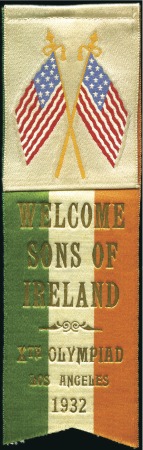 40322   image“Welcome Sons of Ireland / Xth Olympiad” silk ribbon, with two US flags with Irish flag coloured back ribbon, very attractive