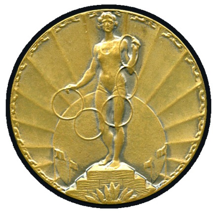 40344   image1935 Netherlands Olympic Day Medal, 40mm, bronze, showing female on a podium holding Olympic rings on front and legend on reverse