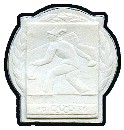 40369   imageCurling plaque, 36x38mm, white porcelain, showing Bavarian curler within laurel wreath with Olympic rings below. Curling was a demonstration sport in 1936