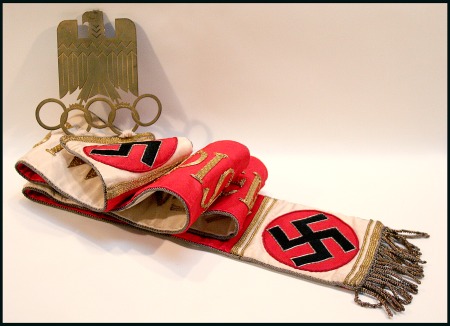 40348   imageOfficial commemorative silk band, 123cm long, gold coloured metal thread embroidery on red on one side and white on the other, with bronze eagle and Olympic rings at top (missing a loop on eagle), illustrated in colour on page 29 of the Official Report, design by Werner Beuke, Berlin and made by M. Jörres, Munich. A very rare and exquisite piece
