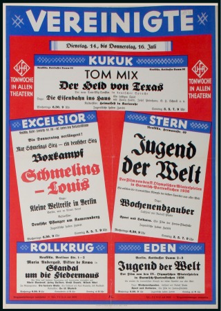 40350   imageTheatre advertising poster, 42x59cm, in red, blue and black, advertising the showing of “Jugend der Welt,” the official film of the Winter Games, two folds, fine and very rare